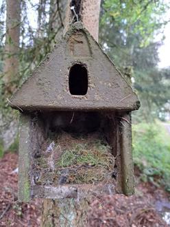 Am unteren Rand des Kohlmeisennests ist Fledermauskot zu erkennen.