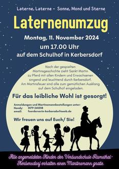 Um 17 Uhr starten die Kinder mit der gespielten Martinsgeschichte. Anschließend zieht Sankt Martin zu Pferd mit allen Kindern und Erwachsenen singend und leuchtend durch Kerbersdorf. Am Martinsfeuer können wir bei warmen Getränken und einer kleinen Stärkung den Abend ausklingen lassen.