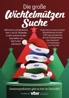 Vom 1. bis zum 24. Dezember gilt es mindestens sechs der farbenfrohen Wichtelmützen mit dem unverkennbaren VTW-Logo zu entdecken und auf dem entsprechenden Feld einer Gewinnspielkarte einzutragen.