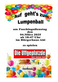 Der Kultur- und Heimatverein Ahl e.V. lädt am Faschingsdienstag den 04.03.2025 zum Lumpenball im Bürgerhaus „Alte Schule Ahl“ ein.