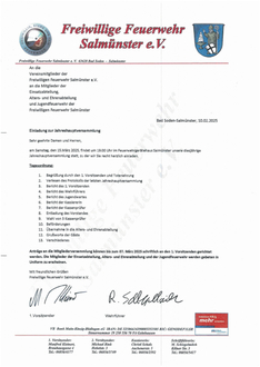 am Samstag, den 15. März 2025, findet um 19.00 Uhr im Feuerwehrgerätehaus Salmünster unsere diesjährige Jahreshauptversammlung statt, zu der wir Sie recht herzlich einladen.