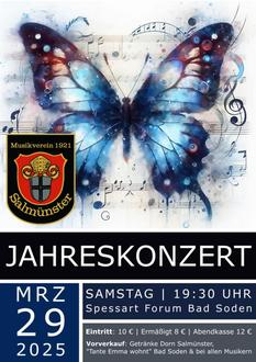 Das Jahreskonzert findet am Samstag, 29.03.2025 um 19:30 Uhr im Spessart-Forum Bad Soden-Salmünster statt. Einlass ist ab 19:00 Uhr.