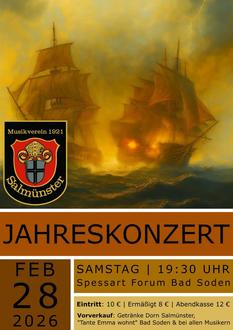 Das Konzert findet am Samstag, dem 28.02.2026, um 19:30 Uhr im Spessart-Forum Bad Soden-Salmünster statt. Einlass ist ab 19:00 Uhr. Karten zum Vorverkaufspreis von 10 € (8 € für Kinder & Jugendliche bis 14 Jahre) sind ab sofort bei „Getränke Dorn“ in Salmünster, „Tante Emma wohnt“ in Bad Soden sowie bei allen Musikern des Vereins erhältlich. Restkarten an der Konzertkasse kosten 12 €.