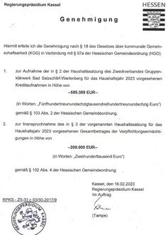 Die nach §93a HGO erforderlichen Genehmigungen der Aufsichtsbehörde zu den Festsetzungen sind erteilt. Sie haben folgenden Wortlaut: