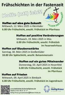 | 06.00 Uhr | Bim | Frühschicht in der Fastenzeit mit anschl. Frühstück |