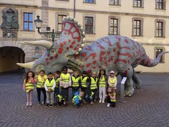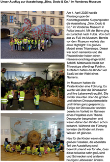 Am 4. April 2025 hat die Piratengruppe der Kindertagesstätte Kurparkpiraten die Ausstellung „Dino, Dodo & Co.“ im Vonderau Museum in Fulda besucht. Mit der Bahn ging es zunächst nach Fulda. Von dort aus zu Fuß ins Museum. Bereits vor dem Museum wartete das erste Highlight: Ein großes Modell eines Triceratops. Dieser war noch namenlos und die Piratenkinder haben einen Namensvorschlag eingereicht: Schlirfi. Mittlerweile heißt der Triceratops allerdings Fuldino. Trotzdem hatten die Kinder viel Spaß bei der Wahl eines Namens.