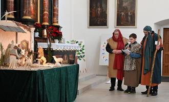 Die Kinder- und Familiensegnung ist im Kalender der Pfarrkirche St. Georg bereits ein fester Termin zwischen den Jahren. Weil sich die Gestaltung diesmal um das Thema Aufbrechen und Ankommen drehen sollte, kam die Idee auf, das Weihnachtsereignis nicht nur in der Kirche, sondern auch entlang des Krippenweges erlebbar zu machen. Alle zwei Jahre stellt der Kultur-, Heimat- und Geschichtsverein im ganzen Ort frei zugänglich Krippen aus aller Welt aus der vereinseigenen Sammlung und von Privatpersonen aus.