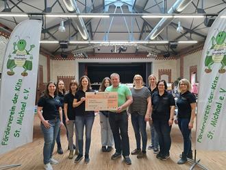 Kristina Sauer, 1. Vorsitzende, nimmt den Scheck, übergeben durch Familie Otterbein, entgegen. Außerdem anwesend: Der Vorstand des Fördervereins der Kita St. Michael