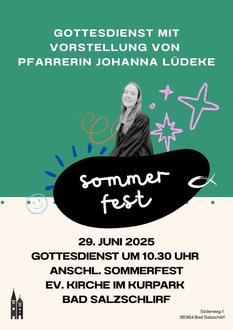 | 10.30 Uhr | Gottesdienst mit Vorstellung von Pfarrerin Johanna Lüdeke durch Dekan Dr. Thorsten Waap mit anschließendem Sommerfest in Bad Salzschlirf |