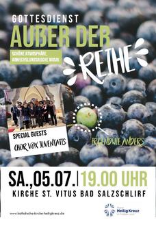 | 19.00 Uhr | Gottesdienst „Außer der Reihe“ mit dem Chor Vox Juventatis |