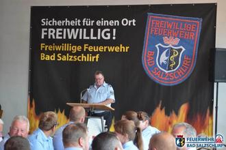 Landrat Bernd Woide danke in seinem Grußwort der Feuerwehr Bad Salzschlirf für Ihren ehrenamtlichen Einsatz für die Bürgerinnen und Bürger und besonders nochmals für die Durchführung der Wasserspiele anlässlich des Kreisjubiläums auf Schloss Fasanerie.