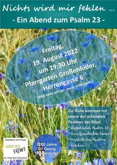 | 19.30 Uhr | Gro | Ein Abend zum Psalm 23 im Pfarrgarten Großenlüder im Rahmen der 1200 Jahr Feier Großenlüder - gestaltet vom Team „Außer der Reihe“ (Bitte Jacke und ggf. Decke mitbringen.) |