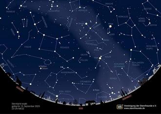 Am östlichen Horizont nehmen nun die Herbststernbilder Platz - beginnend mit dem Sternbild Pegasus, dessen Bauch das gut erkennbare sogenannte Herbstquadrat formt. Unterhalb im Sternbild der Fische leuchtet Saturn, der wunderschöne Ringplanet und letzte Planet in unserem Sonnensystem, den man mit bloßem Augen sehen kann. Jupiter und Venus bleiben der zweiten Nachthälfte und dem Morgengrauen vorbehalten.