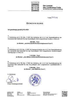 Die nach §§ 102 abs. 4, 103 Abs. 4, 103 Abs. 2 und 105 Abs. 2 HGO erforderlichen Genehmigungen der Aufsichtsbehörde zu den Festsetzungen in den §§ 2, 3 und 4 der Haushaltssatzung sind erteilt. Sie hat haben folgenden Wortlaut: