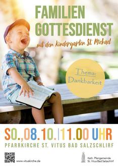 Es gibt vieles, für das wir Gott dankbar sein können. Daher laden wir Sie herzlich ein mit uns am So. 08.10.2023 um 11 Uhr in St. Vitus Bad Salzschlirf einen Familiengottesdienst zum Thema „Dankbarkeit“ zu feiern. Gemeinsam können wir Gott danken, Gemeinschaft erleben und Glauben entdecken.