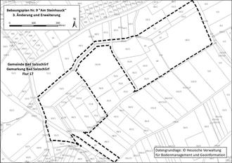 | 1) | Es wird beschlossen, gemäß § 2 (1) BauGB einen Bebauungsplan Nr. 9 „Am Steinhauck, 3. Änderung und Erweiterung“, Gemarkung Bad Salzschlirf aufzustellen. |