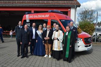 Bürgermeister Kübel erklärte in seiner Ansprache die Notwendigkeit des neuen Mannschaftstransportfahrzeuges und berichtete weiterhin, dass sich die Gesamtkosten auf ca. 91.000 Euro beliefen. Im Anschluss daran segnete Pfarrer Sebastian Latsch von der katholischen und Pfarrer Jörn Schlede von der evangelischen Kirchengemeinde das Fahrzeug.