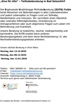 Die Ergänzende Unabhängige Teilhabeberatung (EUTB) Fulda berät Menschen mit Behinderungen in allen Lebensbereichen und jedem Lebensalter zu Fragen rund um Teilhabe,