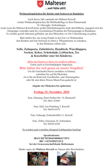 Auch dieses Jahr sammeln die Malteser Kerzell wieder Weihnachtspäckchen für Hilfsbedürftige in ihrer Partnerstadt Sf. Gheorghe/ Siebenbürgen.