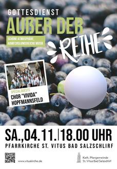 | 18.00 Uhr | Gottesdienst „Außer der Reihe“ mit Chor „Vivida“ Hopfmannsfeld |