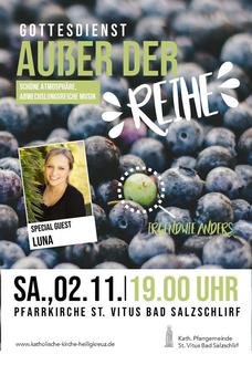 | 19.00 Uhr | Gottesdienst „Außer der Reihe“ mit Luna - wird als Heilige Messe gefeiert |