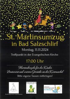 Herzliche Einladung zu unserem diesjährigen Martinsumzug am Montag, den 11.11.2024, um 17:00 Uhr. Beginnen werden wir in der Evangelischen Kirche im Kurpark (Söderweg 1). Gemeinsam ziehen wir dann mit den Laternen und Martinsliedern durch den Kurpark. An der Kurmuschel wird es Martinsbrezel für die Kinder geben. Ebenso werden Bratwurst und warme Getränke zum Verkauf angeboten.