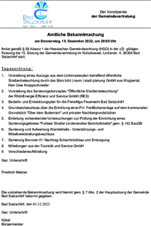 Die vorstehende Bekanntmachung wird hiermit gem. § 7 Abs. 2 der Hauptsatzung der Gemeinde Bad Salzschlirf bekannt gegeben.