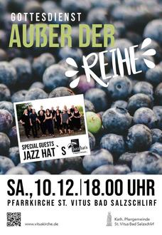 | 18.00 Uhr | Gottesdienst „Außer der Reihe“ unter Mitwirkung der Gruppe JAZZ HAT’s |