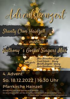 Am Sonntag, den 18.12.2022 findet ab 16.30 Uhr das Konzert des Shanty-Chor´s Hainzell in der Pfarrkirche statt, bei dem wir uns sehr freuen, mitwirken zu dürfen.