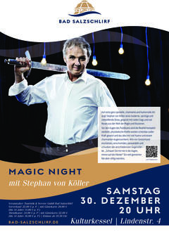 Auf seine ganz spezielle, charmante und humorvolle Art zeigt Stephan von Köller seine moderne, spritzige und verblüffende Show, gespickt mit vielen Gags und viel Neues aus der Welt der Magie und Illusionen.