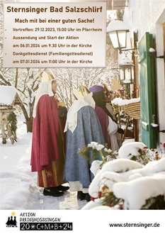 findet die 66. Sternsingeraktion statt. Sie steht unter dem Motto „Gemeinsam für unsere Erde – in Amazonien und weltweit“. Auch in Bad Salzschlirf wollen wir am Samstag, den 6. Januar 2024, wieder Sternsinger durch die Straßen senden, Segen bringen und Spenden sammeln. Doch dazu brauchen wir die Unterstützung aller Einwohner, denn ohne zahlreiche Sternsinger, helfende Hände und ohne angemeldete Haushalte kann die Aktion nicht erfolgreich stattfinden.