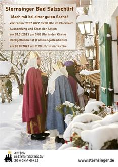 Im Januar 2023 findet die 65. Sternsingeraktion statt. Sie steht unter dem Motto „Kinder stärken, Kinder schützen“. Auch in Bad Salzschlirf wollen wir am Samstag, den 7. Januar 2023, wieder Sternsinger durch die Straßen senden, Segen bringen und Spenden sammeln. Doch dazu brauchen wir die Unterstützung aller Einwohner, denn ohne zahlreiche Sternsinger, helfende Hände und ohne angemeldete Haushalte kann die Aktion nicht erfolgreich stattfinden.