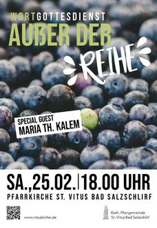 | 18.00 Uhr | Gottesdienst „Außer der Reihe“ mit Maria Th. Kalem |