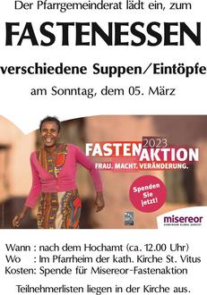 Der Pfarrgemeinderat lädt die ganze Gemeinde wieder zum Fastenessen ins Pfarrheim ein; allerdings wird es wieder in veränderter Form stattfinden. Im Pfarrgemeinderat haben wir überlegt, ein „Büffet“ mit verschiedenen Suppen anzubieten. Hierfür bitten wir noch um 2 bis 3 Suppenspenden. Die Suppen sollten vegetarisch sein und jeweils für etwa 10 Portionen reichen. Wer bereit ist, eine Suppe für das Fastenessen zu kochen, melde sich bitte bei Markus Otterbein (Tel. 1725) oder im Pfarrbüro (Tel. 2397). Wer am Fastenessen teilnehmen möchte, trage sich bitte bis Mittwoch, 1. März in die Liste ein, die hinten in der Kirche ausliegt. Bei Teilnahme am Fastenessen bitten wir um eine Spende für die MISEREOR-Fastenaktion.