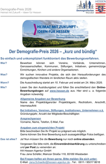 | Wie? | Lesen Sie den Auslobungstext und füllen Sie anschließend den Online-Bewerbungsbogen auf www.hessen.de aus. Hier sind u. a. folgende Angaben notwendig: |