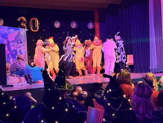 Danach hieß es: Wenn der Bauer ruht, feiern die Tiere! Auf dem Bauernhof war der Teufel los. Katzen (Silke Krug & Michaela Krug), Speedy Gonzales (Marina Reus), der Hund (Sina Seibert), Kühe (Sabine Kirsch & Ingrid Schüler), Schweinchen (Marianne Reus & Uli Schlei), Hühner (Andrea Blum, Judith Post & Claudia Lehmann) und der stolze Hahn (Bettina Post) tanzten zu passender Musik. Der Ausmarsch erfolgte mit einer fröhlichen Polonaise durch den ganzen Saal.
