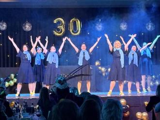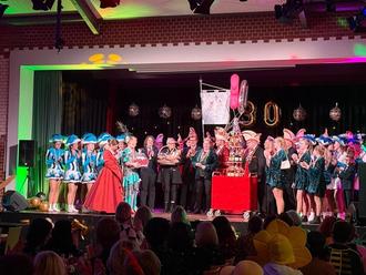 Eröffnet wurde die Sitzung mit der Begrüßung durch Andrea Post und Silke Post. Anschließend zogen die kfd-Frauen in bunten Kostümen aus 30 Jahren Fastnacht unter großem Applaus in den Saal ein. Nicht weniger festlich folgte der Einmarsch des KVBS mit dem diesjährigen Prinzenpaar Prinz Schmo (Christoph Schmorenz) und Prinzessin Cathrin (Cathrin Schmorenz) samt kompletter Prinzenmannschaft und Gefolge. Zum Jubiläum gratulierten sie mit einer riesigen Sekttorte, die feierlich auf die Bühne gerollt wurde. Als weiteres Geschenk begeisterte das Prinzenmariechen Christina Post mit einem rockigen Tanz, ebenso wie die Diamonds und die Prinzengarde. Auch der Vorstand des Clubs närrischer Weiber überbrachte herzliche Glückwünsche – stilecht mit einem riesigen Korb voller Leckereien.