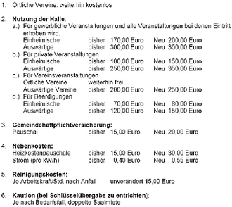Im weiteren Verlauf der Sitzung wurde die Anpassung der Benutzungsgebühren für das Dorfgemeinschaftshaus einstimmig wie folgt beschlossen: