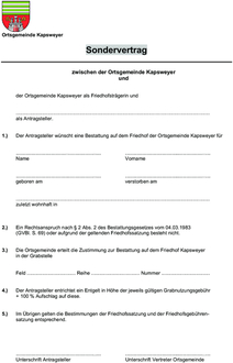 Bei verstorbenen auswärtigen Personen, die gem. § 2 Abs. 4 der Friedhofssatzung kein Recht auf Beisetzung in einer Grabstätte auf dem Friedhof der Ortsgemeinde Kapsweyer haben, wird näheres in einem Sondervertrag geregelt. Ausnahmen hiervon können jedoch erteilt werden, wenn der/die Verstorbene zu Lebzeiten zu der Gemeinde Kapsweyer besondere Bindungen, z.B. früherer Wohnort o. ä. hatte. Über das Vorliegen dieser Voraussetzung entscheidet der Ortsbürgermeister.