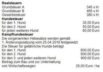 Ferner beschäftigte sich das Gremium mit der Festsetzung der Realsteuerhebesätze, Hundesteuersätze und des Beitrages zum Bau und zur Unterhaltung von Wirtschaftswegen für das Jahr 2024. Einstimmig wurde beschlossen, die Hebesätze für das Jahr 2024 wie im Jahr 2023 zu belassen: