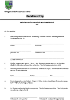 Bei verstorbenen auswärtigen Personen, die gem. § 2 Abs. 3 der Friedhofssatzung kein Recht auf Beisetzung in einer Grabstätte auf dem Friedhof der Ortsgemeinde Vorderweidenthal haben, wird näheres in einem Sondervertrag geregelt.