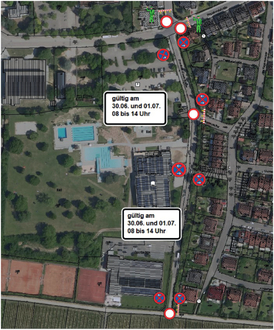 | 2. | In der Friedrich-Ebert-Straße wird nach der Kreuzung Pestalozzistraße, auf beiden Seiten, ein absolutes Halteverbot (VZ 283) mit dem Zusatzzeichen (gültig am 30.06 und 01.07., 08 bis 14 Uhr) angeordnet. |