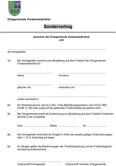 | Ausnahmen hiervon können jedoch erteilt werden, wenn der/die Verstorbene zu Lebzeiten zu der Gemeinde Vorderweidenthal besondere Bindungen, z. B. früherer Wohnort o. ä. hatte. Über das Vorliegen dieser Voraussetzung entscheidet die Ortsgemeinde. |