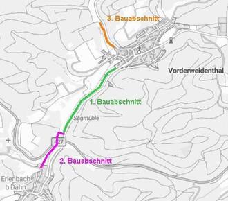 Im 3. und letzten Bauabschnitt wird der Radweg von Vorderweidenthal in Richtung Oberschlettenbach unter Vollsperrung der L 490 hergestellt. Die Umleitung führt über Völkersweiler.