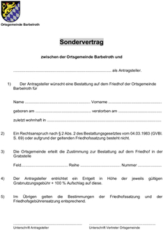 Bei verstorbenen auswärtigen Personen, die gem. § 2 Abs. 3 der Friedhofssatzung kein Recht auf Beisetzung in einer Grabstätte auf dem Friedhof der Ortsgemeinde Barbelroth haben, wird näheres in einem Sondervertrag geregelt.