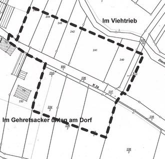 Der Geltungsbereich des Plangebietes umfasst folgende Grundstücke: Die an die Bebauung östlich angrenzenden Flurstücke 240 bis 245 nördlich der Hauptstraße K 24 sowie der dortige Wirtschaftsweg und ein schmaler Streifen östlich dieses Weges. Eine Teilfläche aus der Kreisstraße K 24 Fl.Nr. 950 sowie der dazugehörige Rech FlNrn. 234/1, 236/1, 237/1 und 238/1.Sodann Teilflächen aus den Acker- bzw. Wiesengrundstücken 234/2, 236/2 und 237/2. Das Plangebiet wird im Osten durch einen Streifen neben dem Wirtschaftsweg, im Süden durch die Höhe der Bebauung der Hauptstraße, im Westen durch die bestehende Bebauung und im Norden durch den Dierbach begrenzt, siehe beigefügten Lageplan. Die Gesamtfläche des Plangebietes beträgt ca. 9.200 m².