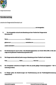 Bei verstorbenen auswärtigen Personen, die gem. § 2 Abs. 2 und 3 der Friedhofssatzung kein Recht auf Beisetzung in einer Grabstätte auf dem Friedhof der Ortsgemeinde Dörrenbach haben, wird näheres in einem Sondervertrag geregelt. Ausnahmen hiervon können jedoch erteilt werden, wenn der/die Verstorbene zu Lebzeiten zu der Gemeinde Dörrenbach besondere Bindungen z. B. früherer Wohnort o. ä. hatte. Über das Vorliegen dieser Voraussetzung entscheidet die Ortsgemeinde.