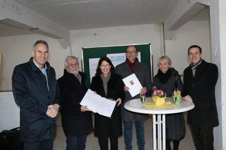 Wirtschaftsministerin übergibt Förderbescheid: (v.l.n.r.) D. Seefeldt (Landrat Südliche Weinstraße), H. Bohrer (Bürgermeister Verbandsgemeinde Bad Bergzabern), D. Schmitt (Wirtschaftsministerin), D. Zoller (Dekan Protestantische Kirchengemeinde Bad Bergzabern), G. Schäfer (Erste Beigeordnete Stadt Bad Bergzabern), Chr. Burkhart (Stellvertretender Vorsitzender LAG Pfälzerwald plus).