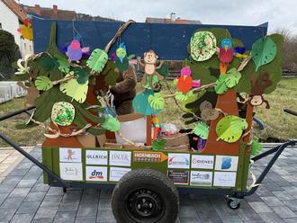 Mit viel Liebe zum Detail wurde der Wagen im Vorfeld dekoriert. Zwischen Palmen, Lianen und zahlreichen von den Kindern selbst gebastelten Dschungeltieren war schnell klar: Hier rollt der Urwald an. Ein Dankeschön geht an die Erzieherinnen, die gemeinsam mit den Kindern die farbenfrohe Dekoration gebastelt haben.
