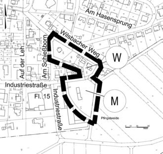 Die Wohnbaufläche grenzt im Nordosten an den Wilsbacher Weg und im Westen an die Straße „Am Schießborn“ an. Der südwestliche Rand dieser Fläche tangiert die Grundstücke „Am Schießborn“ Nr. 1 sowie Industriestraße Nrn. 3 und 5